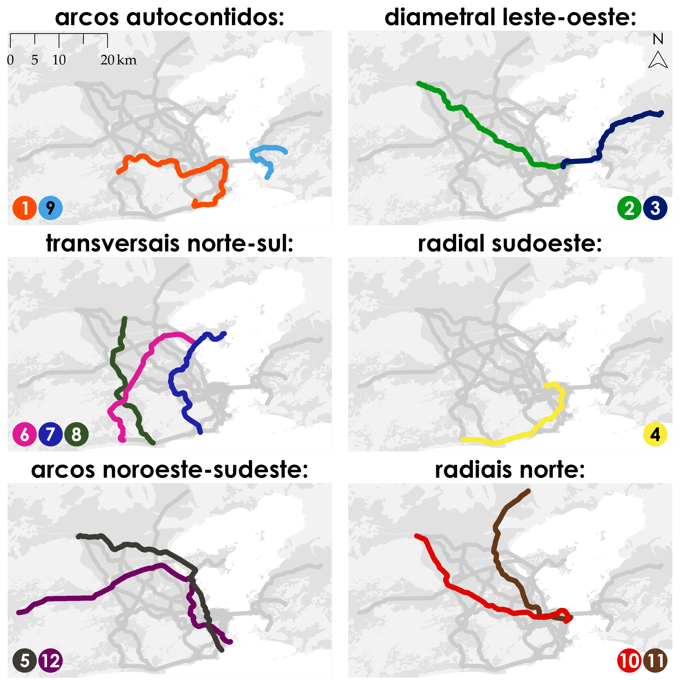 Isso significa que boa parte das imagens que apresentam o sistema de transportes proposto no livro, senão todas, teriam que ser substituídas. Esse seria um trabalho imenso e eu poderia optar por simplesmente suprimir a minha compulsão, mas, veja bem, isso nunca foi uma escolha. Eu já tinha uma certa antipatia com algumas cores que estavam muito semelhantes (linhas 3 e 7, principalmente), então bati o martelo muito antes de fazer esse post. Se vocês não lembram das cores na rede que publiquei aqui há poucas semanas, ou há mais tempo nas redes sociais, elas nunca existiram, porque eu já as substituí.