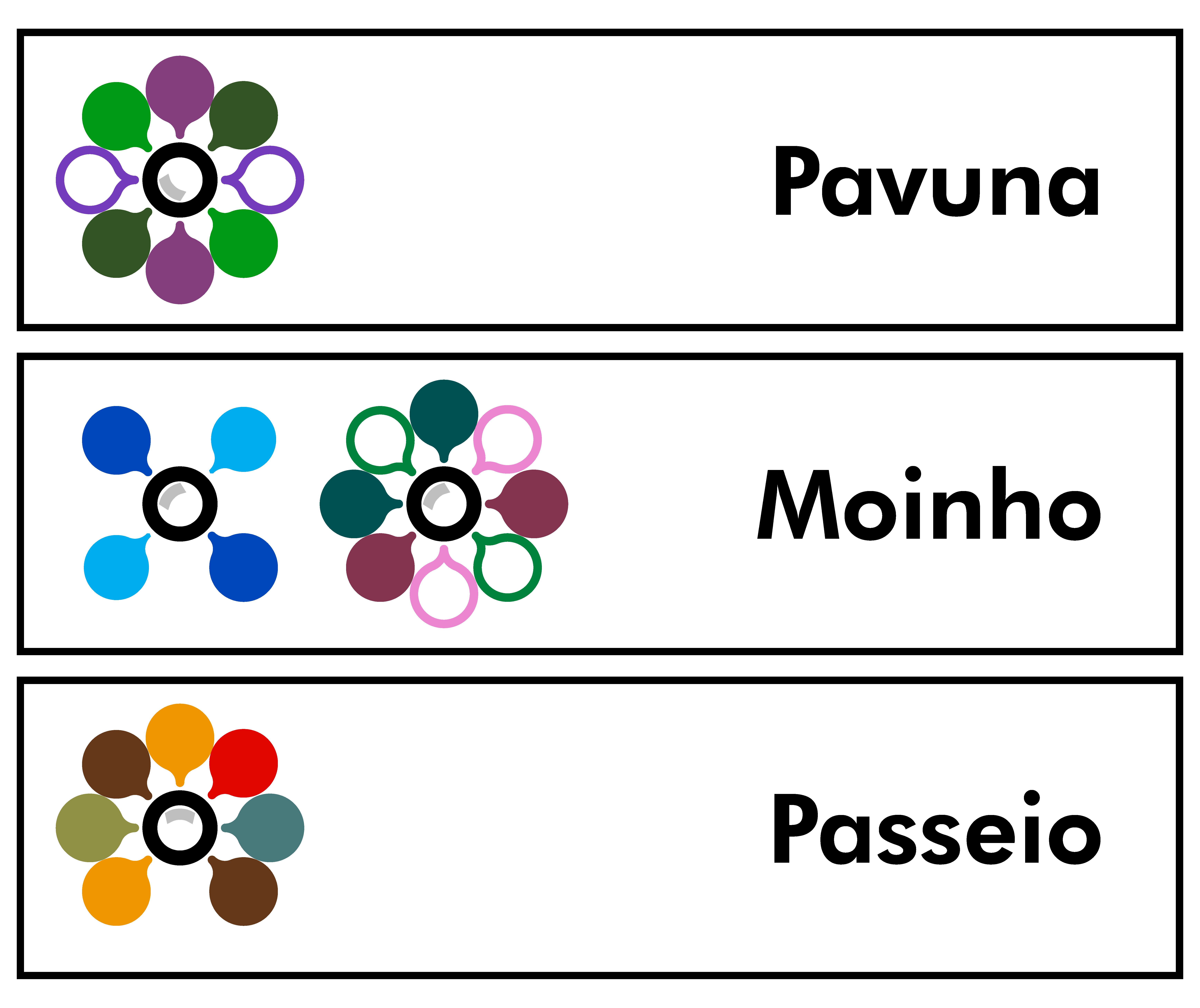 Um detalhe que fiz questão de aplicar foi possibilitar a adaptação do logo para representar estações de transferência. Os balões (ou orbitais, ou pétalas) são elementos modulares, que podem ser retirados ou colocados. Nesse caso, eles também são excelentes para simbolizar as ligações de transporte público, com as cores das linhas que podem ser acessadas. Basta adicionar algo para indicar o norte (exemplo: escolhi um arco cinza) que o logo funciona exatamente como uma bússola. Assim, todo ponto de baldeação, toda estação, teria seu símbolo próprio! Na figura abaixo, fiz um experimento com estações do Plano QUERO.